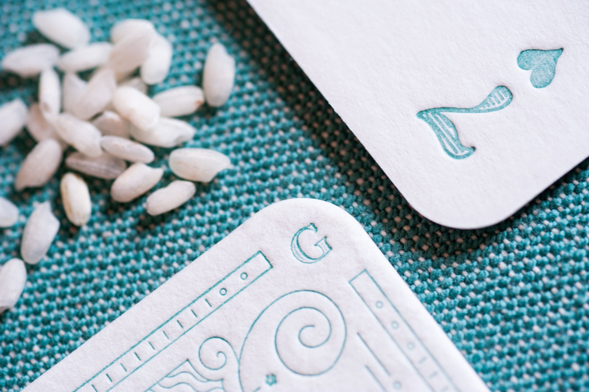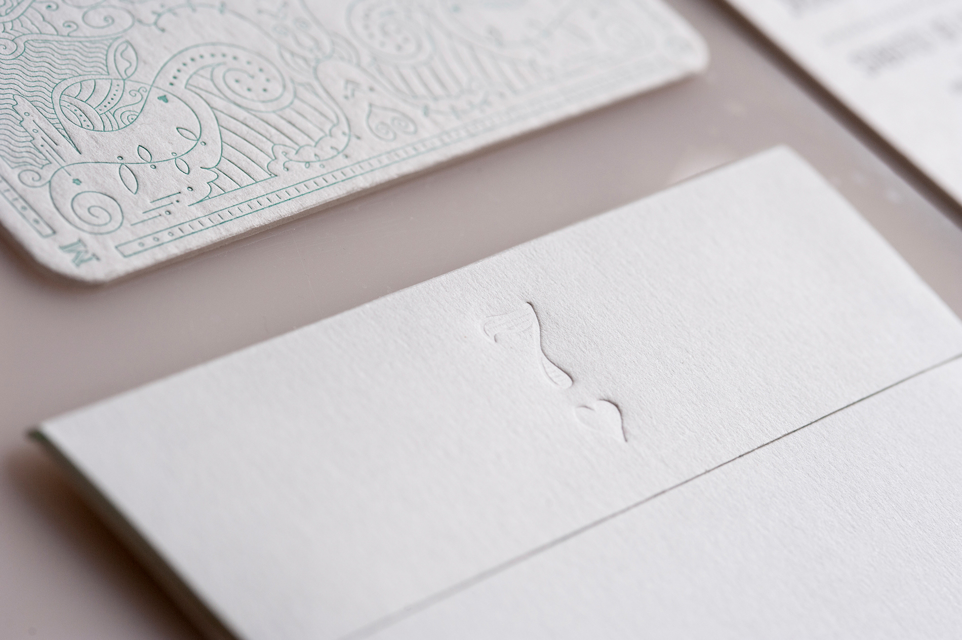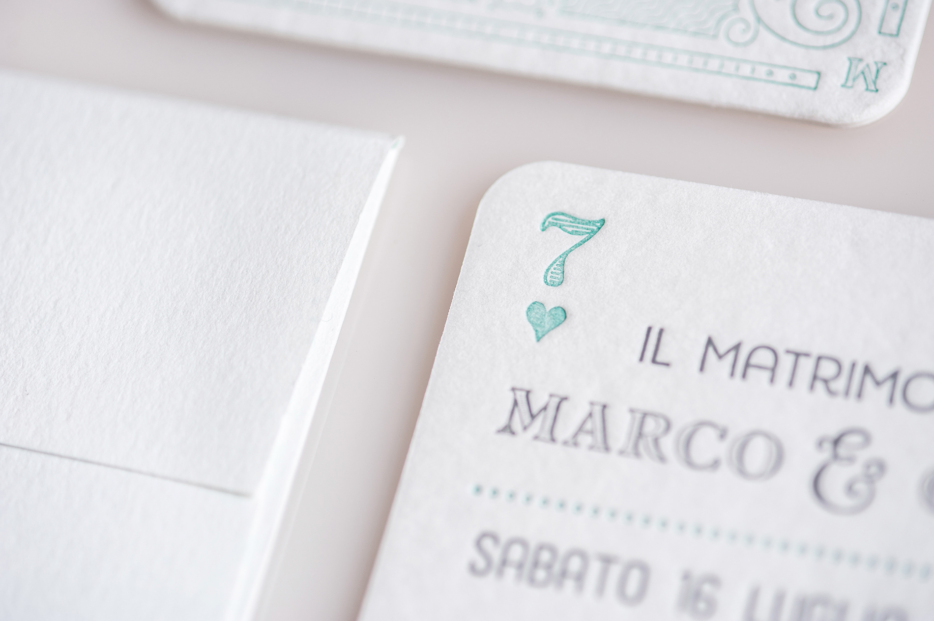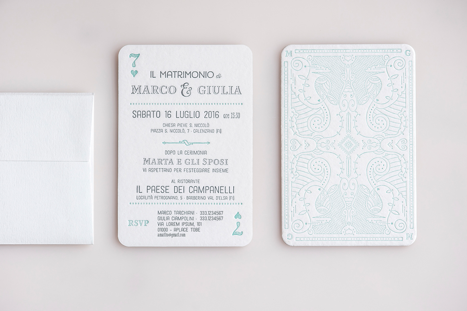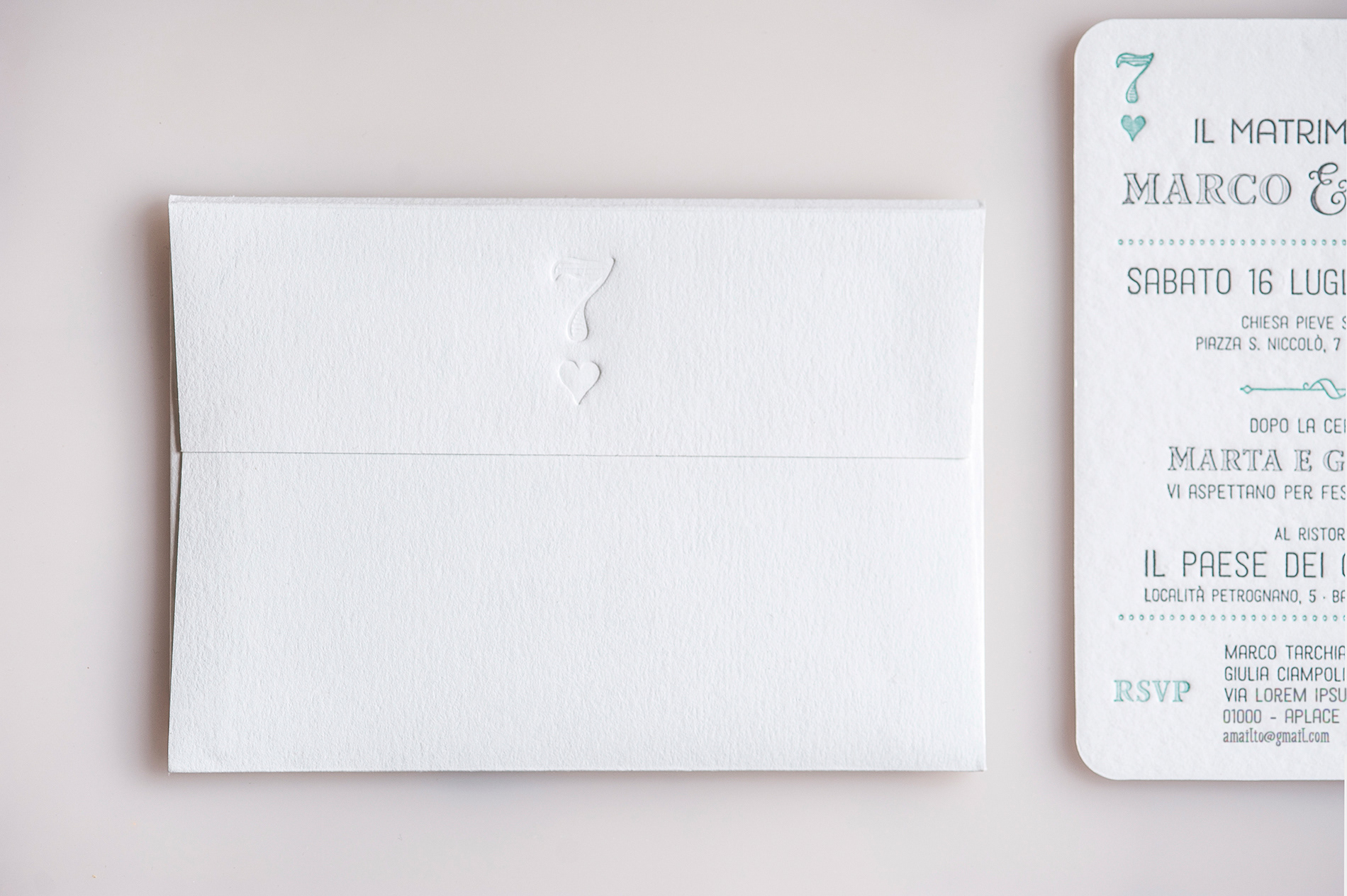 Progetto grafico partecipazioni di matrimonio. Stampa letterpress due colori su carta Cordenons Wild 850 grammi, buste bottellate a secco e internografate a un colore